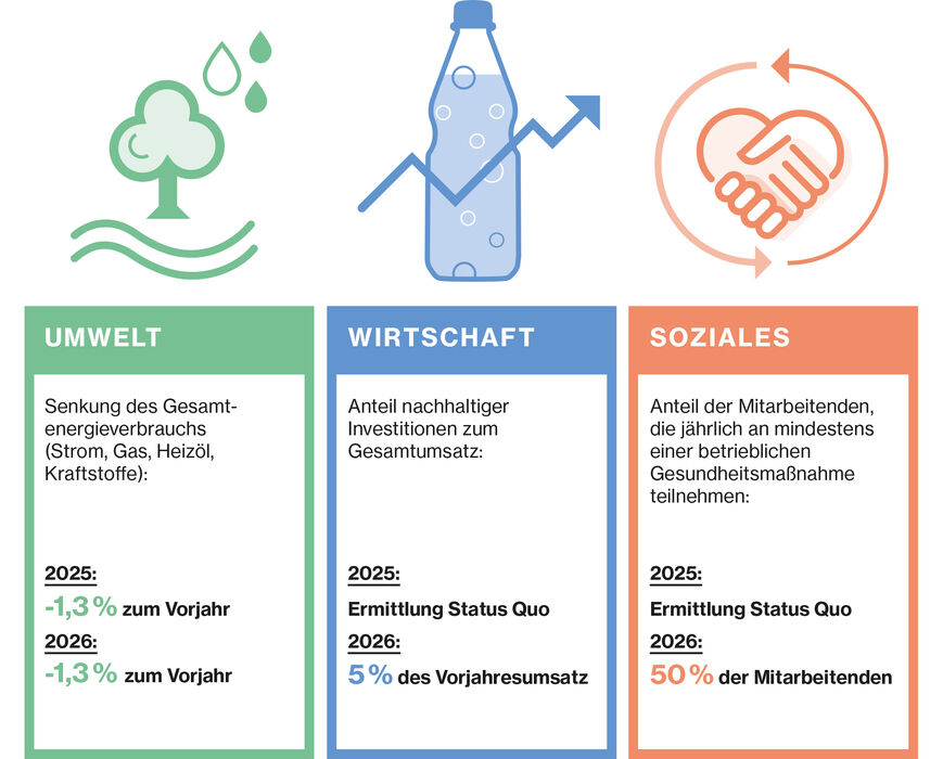 In diesem Zusammenhang stellen wir beginnend ab 2025 unsere gesamte PKW-Flotte kontinuierlich auf Elektrofahrzeuge um. Im Bereich Wirtschaft werden wir unseren Anteil an nachhaltigen Investitionen in moderne Technik, energieeffizientere Gebäude und umweltfreundlichere Getränkeverpackungen erhöhen. Die Grundlage für ein wirtschaftlich erfolgreiches und ökologisch verantwortungsvolles Unternehmen sind seine Mitarbeitenden. Unserem Familienunternehmen liegt deshalb die Gesundheit des Teams besonders am Herzen. In diesem Zusammenhang bieten wir unter anderem individuelle Gesundheitstage an unseren einzelnen Standorten an. Gruppenweit gibt es umfangreiche Fitness-Angebote.