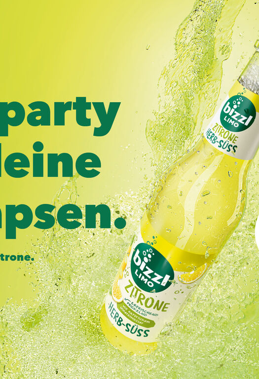 Die neuen 0,5 L HERB-SÜSS Glasprodukte stehen im Mittelpunkt der Kampagne. Die beiden Limonaden zeigen sich in erfrischenden ungesehenen Perspektiven. Die Bildsprache ist aufmerksamkeitsstark und die Headlines überraschend. Mit dieser maximal erfrischenden Produktinszenierung sorgen bizzl HERB-SÜSS Zitrone und Orange für „eine Poolparty der Synapsen“ oder bringen die „Schmetterlinge auf der Zunge“ zurück.