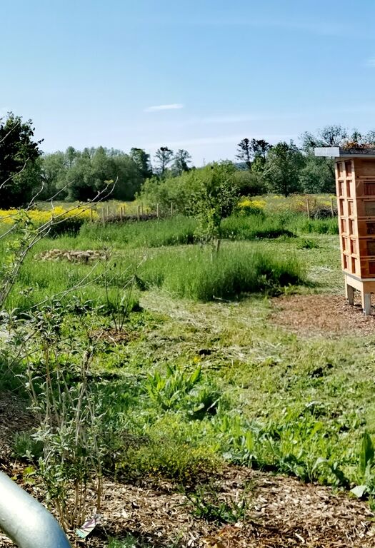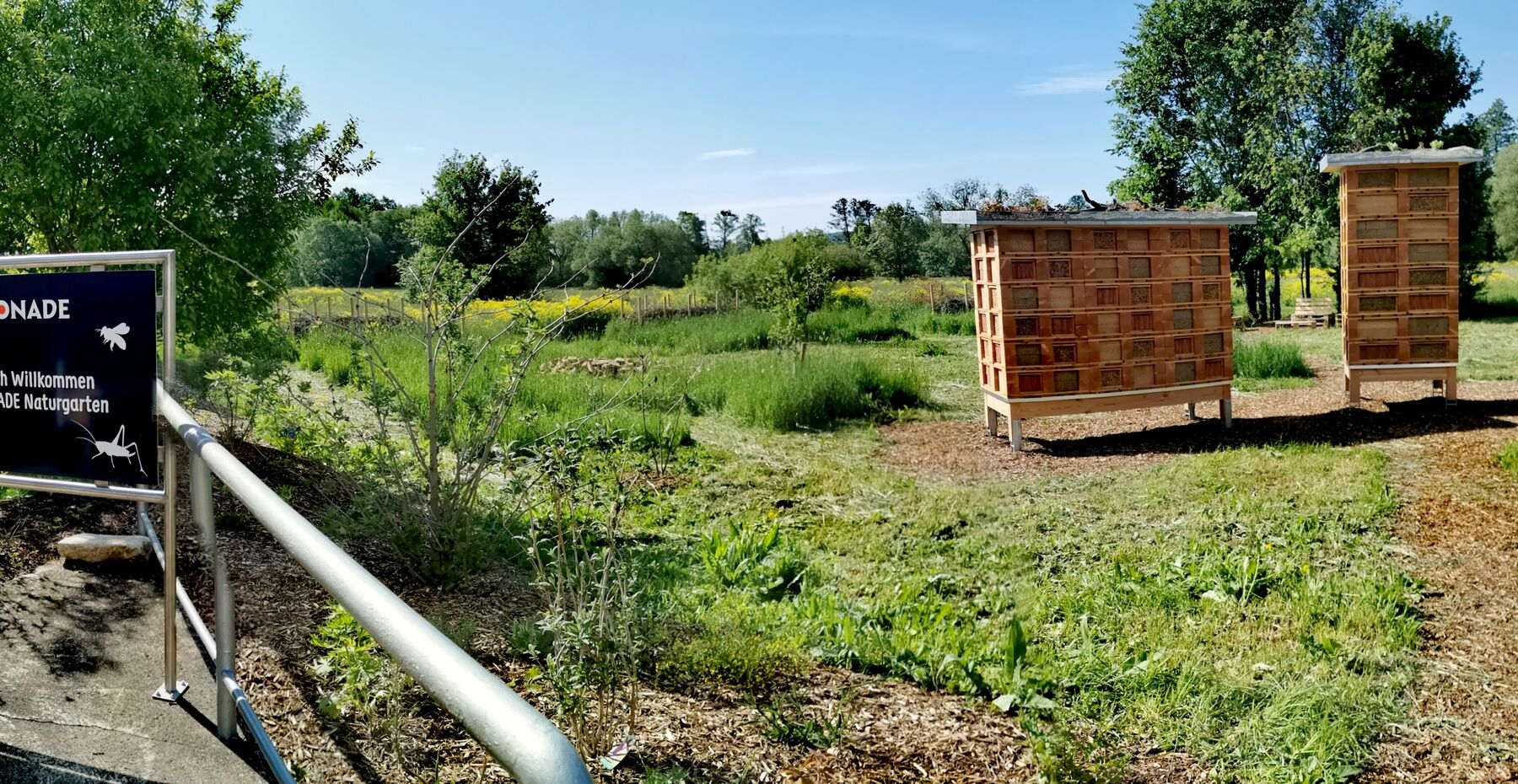 Sie heißen „Gänseblümchen“ und „Lavendel“, „Naschgarten“ und „Wiesenkönigin“: Die Zimmerkategorien im wilden Wiesenhotel, in die einige tausend Wildbienen, Hummeln, verschiedene Wespenarten, aber auch Käfer und andere Krabbeltiere ab sofort einziehen können. Das Umfeld bietet ein nektarreiches Buffet dank der naturbelassenden Wiese, auf der die neuen Bewohner jede Menge Obstbäume, Gehölze sowie bienenfreundliche Stauden finden. Der 1,4 Hektar große BIONADE Naturgarten grenzt direkt an das Betriebsgelände. Die Neugestaltung des Areals geplant sowie bei Wind und Wetter umgesetzt haben engagierte BIONADE Mitarbeiterinnen und Mitarbeiter, mit Hilfe heimischer Handwerker wie Schreiner, Gärtner und Spengler. Fundamente mussten gelegt, Wege angelegt, Pflanzen eingesetzt, drei Insektenhotels samt Vogelhäusern gebaut sowie Sitzgelegenheiten integriert werden.