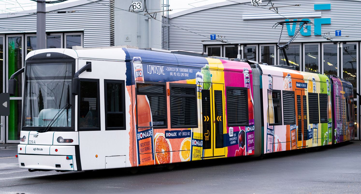 Die BIONADE Limo-Vielfalt macht vor dem öffentlichen Nahverkehr nicht Halt: Das Frankfurter und Kölner Stadtgebiet gestaltet der Bio-Ponier mit Straßenbahnen im Markendesign jetzt noch ein bisschen bunter.