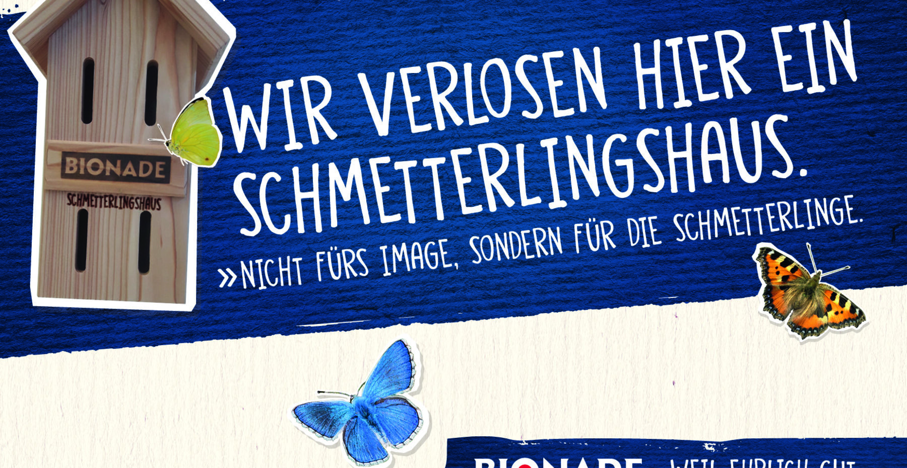 Damit die Vielfalt der Falter erhalten bleibt, können Menschen helfen. Zum Beispiel mit artgerechten Schmetterlingshäusern vom BIONADE: Jeweils eins von insgesamt 750 gibt es von Anfang Februar bis Ende April bei jedem beteiligten Handelspartner zu gewinnen – unterstützt von aufmerksamkeitsstarken POS-Aufbauten.