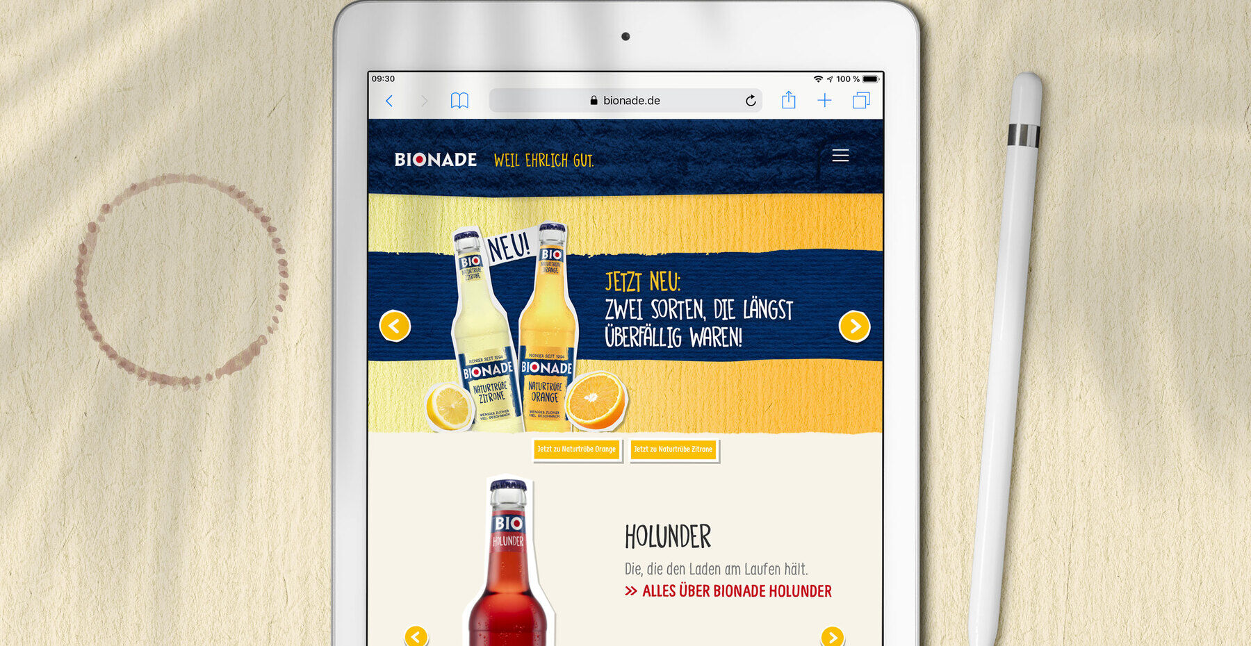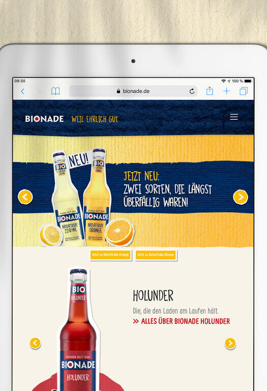 Übersichtlich, aufgeräumt und kompakt ist die neue BIONADE Website. Lediglich drei Menüpunkte fassen alles Wissenswerte zusammen: „Unsere Sorten“, „Das steckt drin“ und „BIONADE erleben“ zeigen den Besuchern die wichtigsten Informationen. Hinzu kommen spielerische Elemente wie das Sorten-Rad auf der Startseite oder der 3D-Globus, um die BIONADE Sorten und ihre 100 Prozent Bio-Rohstoffe zu erkunden.