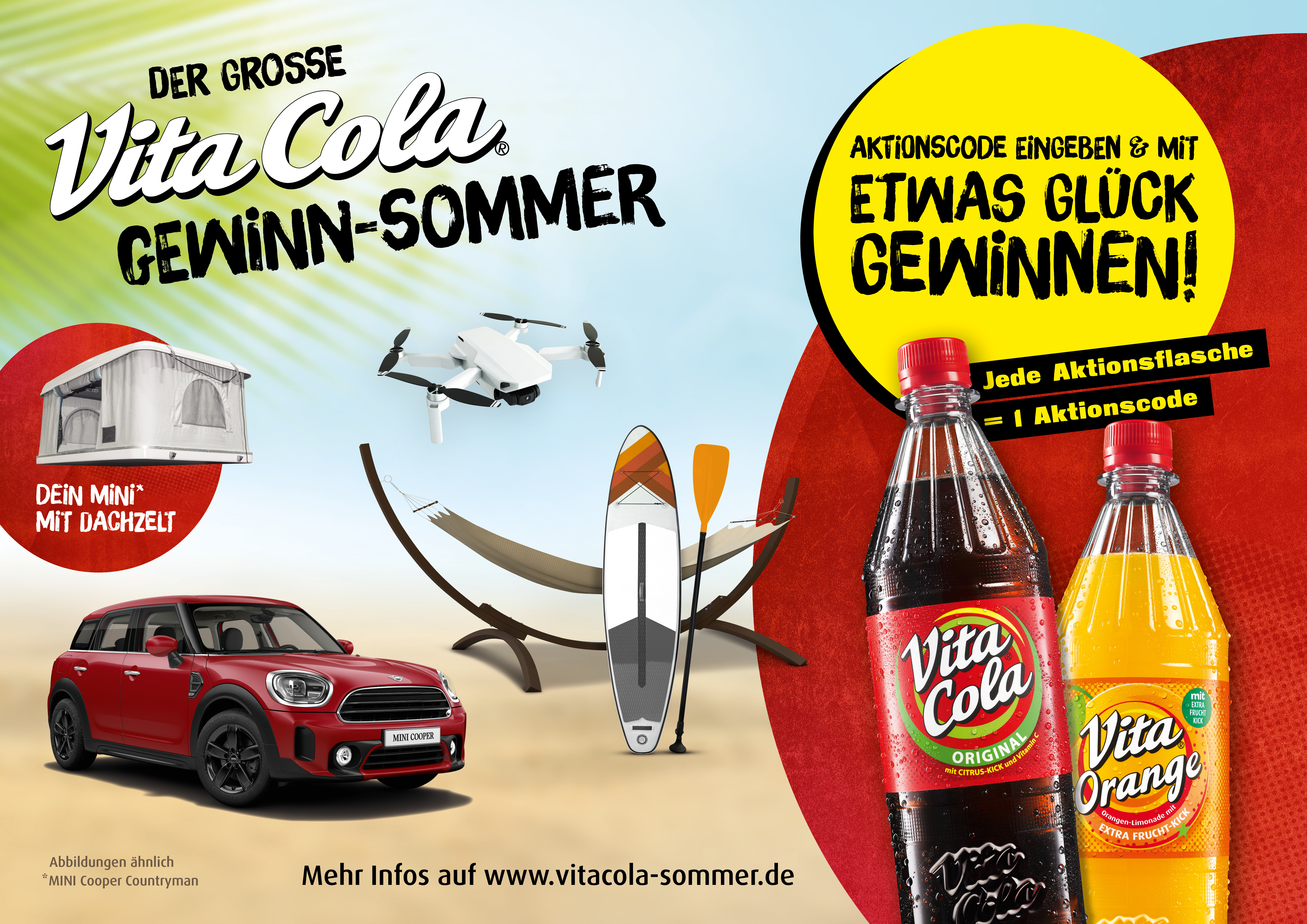 Für die Verlosung werden insgesamt 6,2 Millionen 1,0-l-PET-Mehrwegflaschen von drei Sorten VITA COLA und vier VITA LIMOs mit Aktionscodes im Umlauf sein. Jeder Code, der bis 30. Juni auf der Aktionswebsite www.vitacola-sommer.de eingegeben wird, sichert den Teilnehmern die Chance auf einen attraktiven Tagesgewinn. Ob man zum Beispiel eine XXL-Hängematte, eine Hobby-Drohne von DJI oder ein Board für den ultimativen Sommertrend Stand up Paddling gewonnen hat, wird sofort verraten. Alle Teilnehmer landen außerdem im Lostopf für den MINI Cooper Countryman mit Dachzelt.