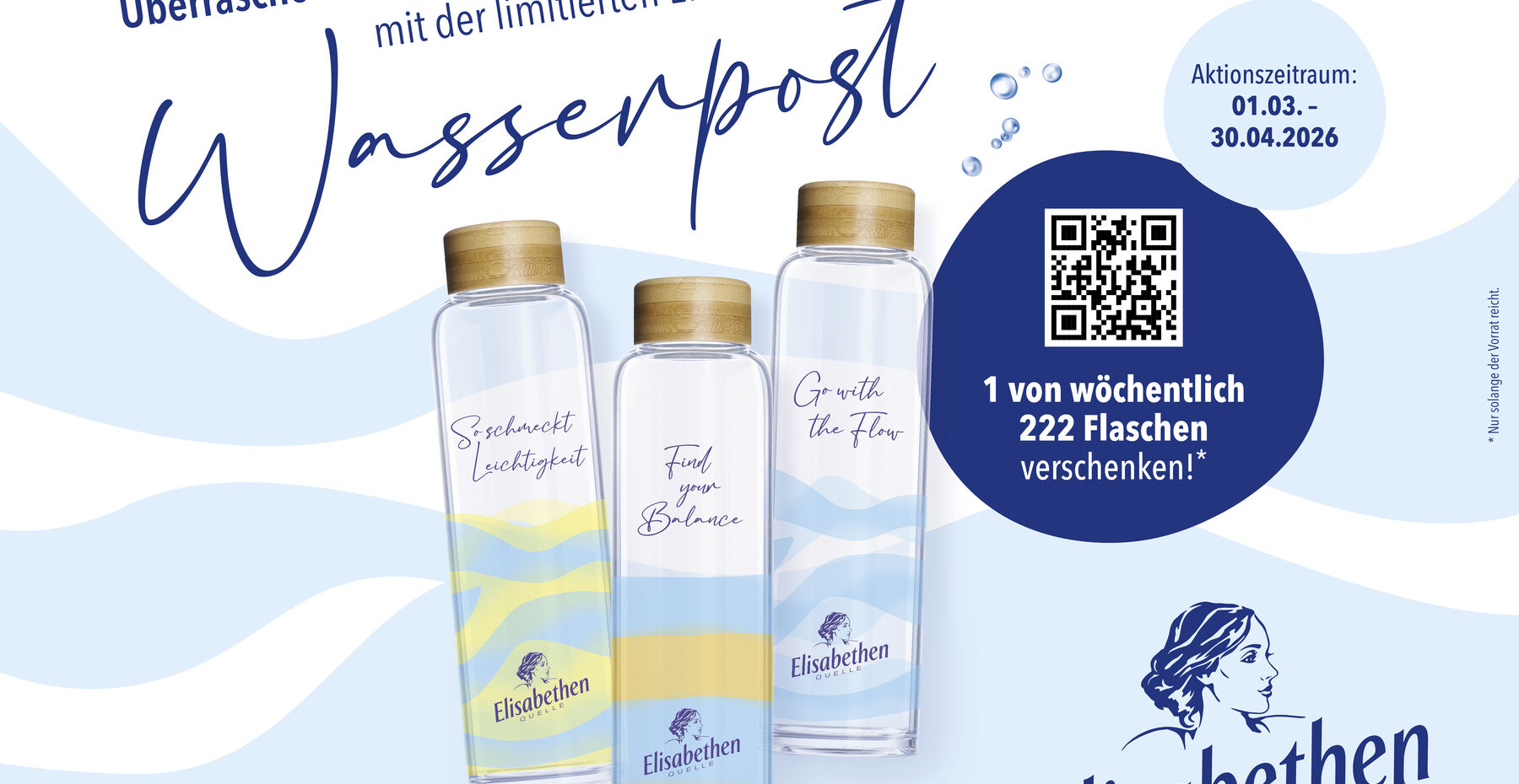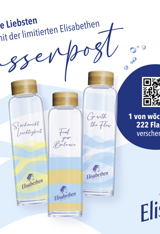 Wer im Aktionszeitraum vom 1. März bis zum 30. April 2026 zwei Kästen Elisabethen Quelle Mineralwasser kauft und den Kassenbon unter elisabethen-aktion.de hochlädt, kann einen lieben Menschen mit der Elisabethen Quelle Wasserpost überraschen. Der Empfänger erhält automatisch eine Präsentbox mit einer von insgesamt drei ansprechend gestalteten hochwertigen Belamy-Trinkflaschen aus Glas, einer Flasche Elisabethen Quelle Mineralwasser und einer personalisierten Grußkarte.