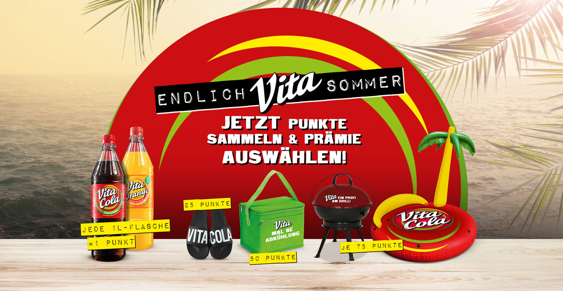 Schmalkalden/Lichtenau, 4. April 2019. Wird der Sommer 2019 wieder so heiß wie der letzte? Statt lang darüber zu spekulieren, macht VITA COLA mit ihrer Consumer Promotion 2019 unter dem Motto „Endlich VITA Sommer!“ lieber gleich richtig Lust auf die schönsten Wochen des Jahres: Wer im Aktionszeitraum vom 1. April bis 30. Juni die VITA COLA-Aktionsprodukte kauft, kann sich exklusive Sommerprämien sichern. Dafür muss man lediglich die entsprechenden Kassenbons auf www.seid-tatendurstig.de hochladen. Zu den Aktionsprodukten zählen alle 1,0 l PET-Mehrwegflaschen der VITA COLAs und VITA Limonaden. Für eine Flasche erhält der Verbraucher einen Punkt. Als Einstiegsprämie (25 Punkte) gibt es coole VITAletten, für 50 Punkte eine praktische Kühlbox mit integrierter Powerbank. Und wer 75 Punkte gesammelt hat, kann gleich zwischen zwei Prämien wählen. Hier winken ein handlicher Kugelgrill oder eine angesagte Badeinsel.