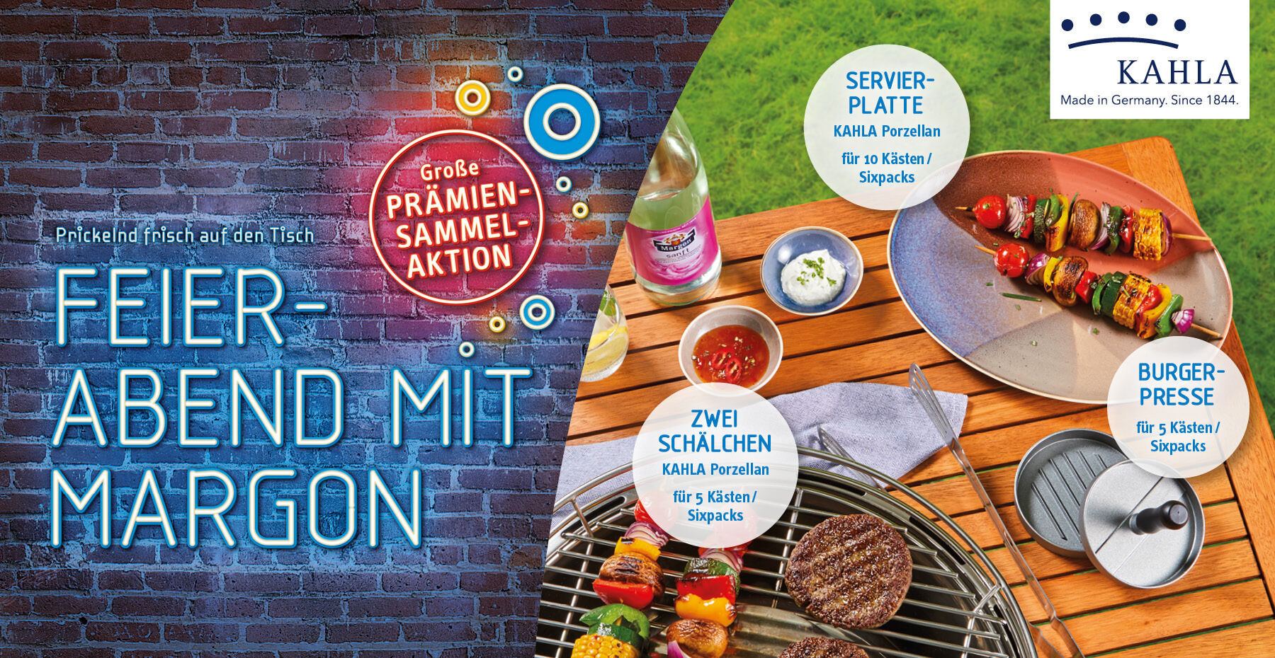 Im gesamten Aktionszeitraum können Verbraucher/-innen ihre Kassenbons unter www.margon-sammelaktion.de hochladen oder direkt an Margon senden. Bereits für fünf gekaufte Getränkekästen oder Sixpacks erhalten Kunden zwei kleine Dipp-Schälchen aus hochwertigem Porzellan von KAHLA oder eine hochwertige, antihaftbeschichtete Burger-Presse. Ab zehn Getränkekästen oder Sixpacks gibt es eine Servierplatte, ebenfalls aus hochwertigem Porzellan von KAHLA. Eine optimale Präsentation der Speisen ist somit gesichert: Ob es nun der perfekte Gemüsepatty oder Beefpatty ist, die tollen Grillspieße auf der Servierplatte oder auch die leckere Grillsoße im Dipschälchen. Und ganz nebenbei passen alle Artikel zu den letzten Prämienaktionen.