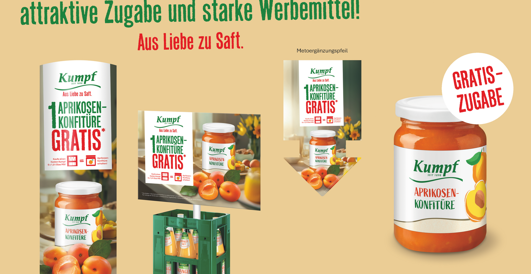 Mit der fruchtigen Zugabe-Aktion wird die Sichtbarkeit der Marke Kumpf am POS erhöht, während Konsumenten gleichzeitig vom genussvollen Mehrwert der Aprikosen-Konfitüre profitieren. Neue Werbemittel sorgen dabei für maximale Aufmerksamkeit für Kumpf. Erstmals gibt es einen Flaschenstecker als Werbemittel für eine noch größere Kommunikationsfläche.