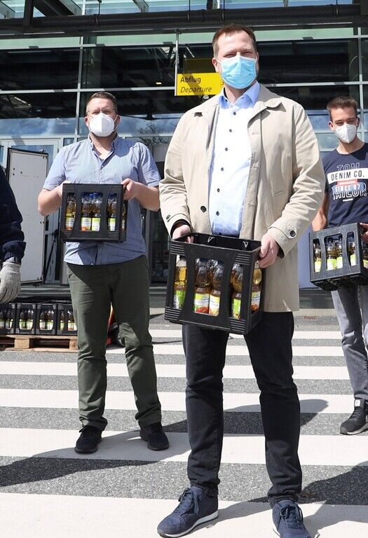 Das Mecklenburger Traditionsunternehmen Güstrower Schlossquell unterstützt das engagierte Corona-Impfteam des Landkreises Rostock: Güstrower-Mitarbeiter lieferten jetzt 5.000 Liter Apfelschorle im „Impfhafen“ am Flughafen Rostock-Laage an. Rund 40 Helfer sorgen hier vor Ort sowie mit zusätzlichen mobilen Impfteams dafür, dass aktuell täglich tausende Menschen der Region gegen das Corona-Virus geimpft werden. Das Team des Impfhafens umfasst dabei Menschen verschiedenster Berufe und Tätigkeiten von Ärzten, über Mitarbeiter des Flughafens Rostock und der lokalen Tourismusbranche bis hin zu Ehrenamtlichen.