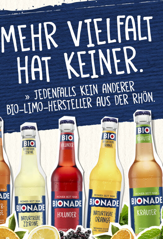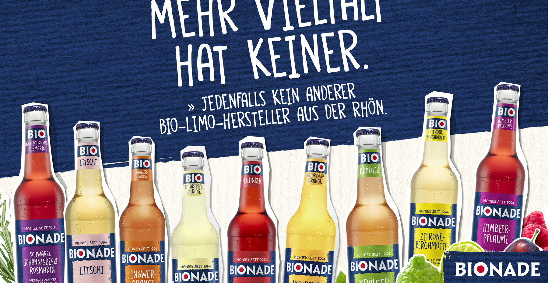 Die neue Bestmarke seit Übernahme durch das Familienunternehmen HassiaGruppe vor vier Jahren resultiert aus einer konsequenten Marketing- und Vertriebsarbeit, untermauert durch stetige Investitionen in neue Sorten, Gebinde und Kommunikationsmaßnahmen. Dazu zählen auch der Startschuss für die Mitmach-Initiative „Vielfalt 2030“ zum Erhalt der Artenvielfalt, der Bau des BIONADE Naturgartens samt wildem Wiesenhotel oder verschiedene Sondereditionen. Svenja Lonicer: „Neun von zehn Verbrauchern kennen inzwischen BIONADE. Ein überragender Wert, den wir mit hohem Werbedruck weiter festigen wollen, auch mit einer neuen Kampagne.“ Im Fokus der ab Sommer 2022 geplanten TV-Spots, Plakate, Online- und Social Media-Aktivitäten wird die Vielfalt des BIONADE Sortiments stehen.