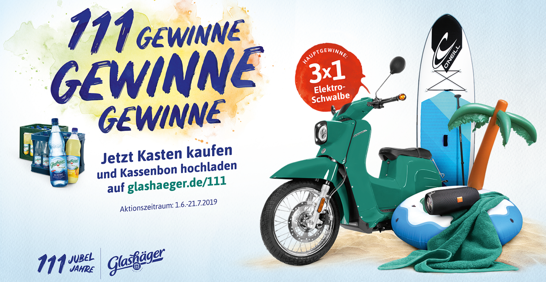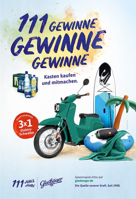 Bad Doberan, d. 31.05.2019. Der Glashäger Brunnen aus Bad Doberan feiert seinen 111. Geburtstag mit einer großangelegten Consumer Promotion. Dazu werden insgesamt 111 Preise für Sommer, Sonne und Strand verlost. Neben hochwertigen SUP Boards und Bluetooth-Boxen haben die Teilnehmer die Chance auf bequeme Badeinseln und extragroße Glashäger Badehandtücher. Die drei Hauptgewinner können sich über jeweils eine „E-Schwalbe“ freuen. Das Moped mit dem kultigen Design verfügt über einen leisen, nachhaltigen Elektroantrieb und sorgt für stilechten Fahrspaß in der Stadt und bei der Fahrt ans Wasser.