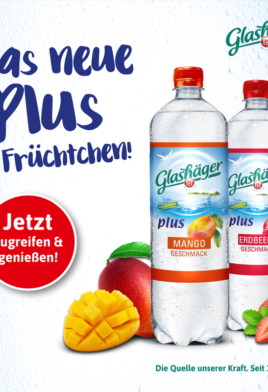 Glashäger bringt den Geschmack des Sommers in die Getränkeregale: Die beliebte Flavoured-Water-Range Glashäger Plus ist seit April in den neuen Geschmacksrichtungen Erdbeere und Mango erhältlich. Die fruchtigen Durstlöscher vergrößern das bestehende Sortiment aus Kirsche, Himbeer und Pfirsich. Angeboten im praktischen 1,0 Liter PET-Einweggebinde für den Unterwegskonsum sowie als handlicher Sechserpack sorgen sie für mehr Auswahl und Vielfalt im wachsenden Wasser-Plus-Markt.