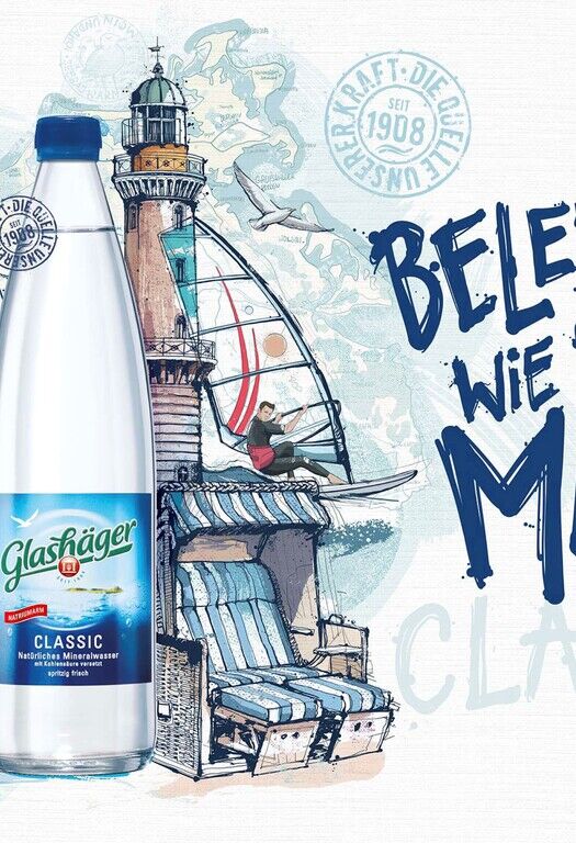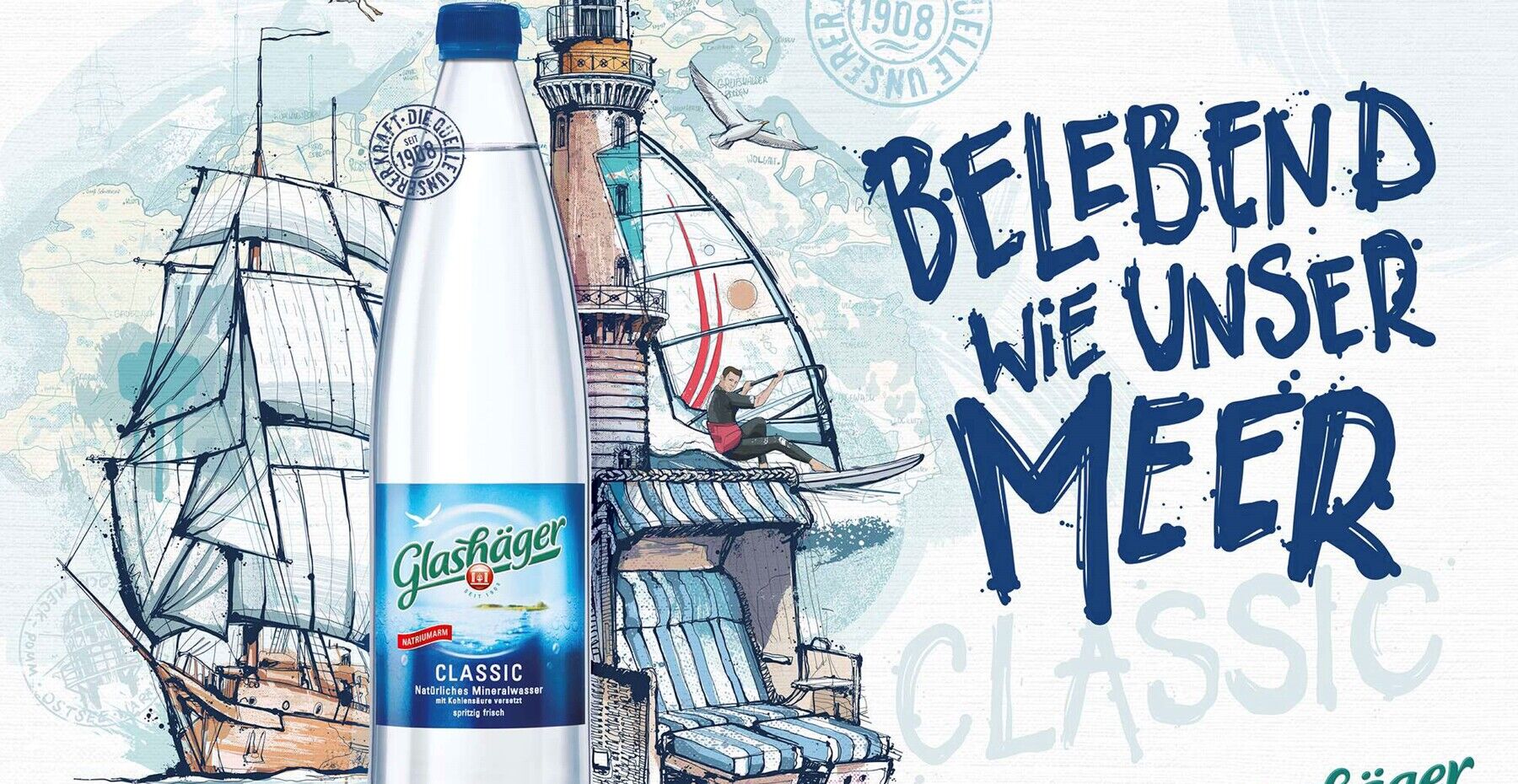 Auf den Plakatmotiven verbindet sich jede der vier Sorten Glashäger Mineralwasser mit einem prägenden, landschaftlichen Element: Glashäger Classic ist „belebend wie unser Meer“ und Medium „erfrischend wie unsere Seen“. Auch das sanfte und das stille Glashäger Mineralwasser werden mit den ureigensten Schönheiten und der Identität des Landes Mecklenburg-Vorpommern grafisch und inhaltlich verknüpft. „Diese Kampagne ist ein Spiegelbild unseres Landes und unserer Mentalität“, sagt Axel Schümann, Leiter Marketing beim Glashäger Brunnen aus Bad Doberan. „Glashäger Mineralwasser ist integraler Bestandteil unserer Region und tief in der Erlebniswelt der Menschen verwurzelt. Christoph Kadur zeigt mit seinen kunstvollen Illustrationen, dass sowohl das Unternehmen als auch unser Mineralwasser dieser Region entspringen. Unsere erfolgreiche Dachkampagne ‚Unser Land genießen‘ erlebt dadurch zweifellos ihren Höhepunkt.“