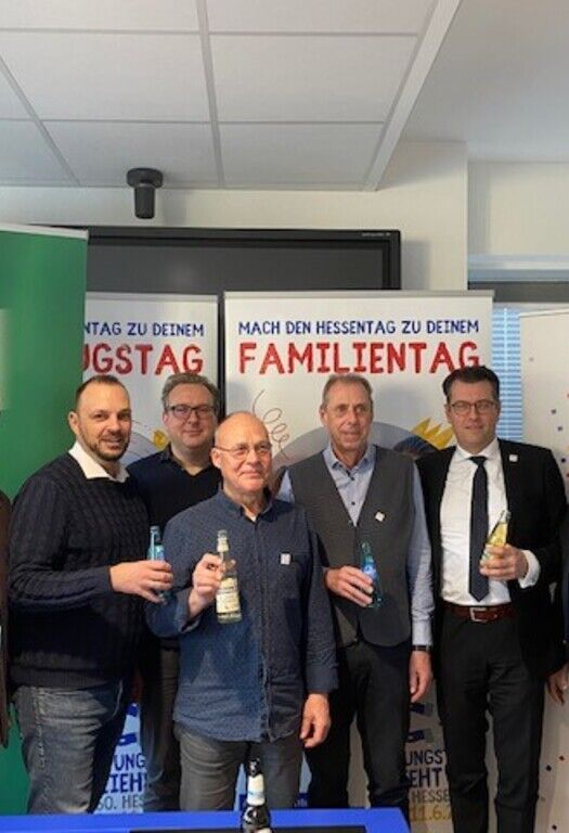 BU: (v.l.n.r.) Reiner Maurer (Hessentagsbeauftragter), Patrick Koch (Bürgermeister), (5.ter v. l.) Friedhelm Büchsel (Hessentagsbeauftragter), Martin Sons und Michael Seufert von Hassia Mineralquellen (rechts)