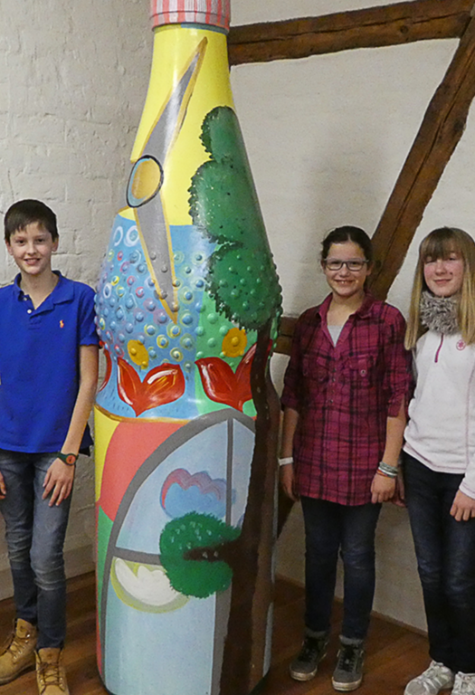 Die offizielle Übergabe der beiden Flaschen an den Glashäger Brunnen in der vergangenen Woche war vor allem von den jungen Künstlern, insgesamt 13 Doberaner Jungen und Mädchen zwischen 10-12 Jahren, mit großer Vorfreude und Aufregung erwartet worden. Die größere der beiden Flaschen wurde von den Schülern der Münsterschule sogar mit einer kleinen Choreografie an den Leiter des Marketings bei Glashäger, Axel Schümann, übergeben. „Mir gefallen die gestalteten Flaschen außerordentlich gut. Die Kinder haben das wirklich toll gemacht.“, sagt Axel Schümann und ergänzt: „Die wochenlange Arbeit hat sich sichtlich gelohnt.“
