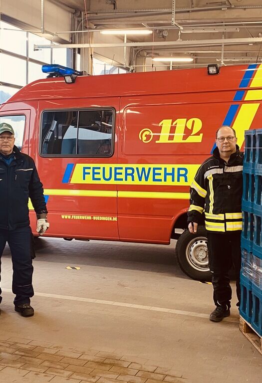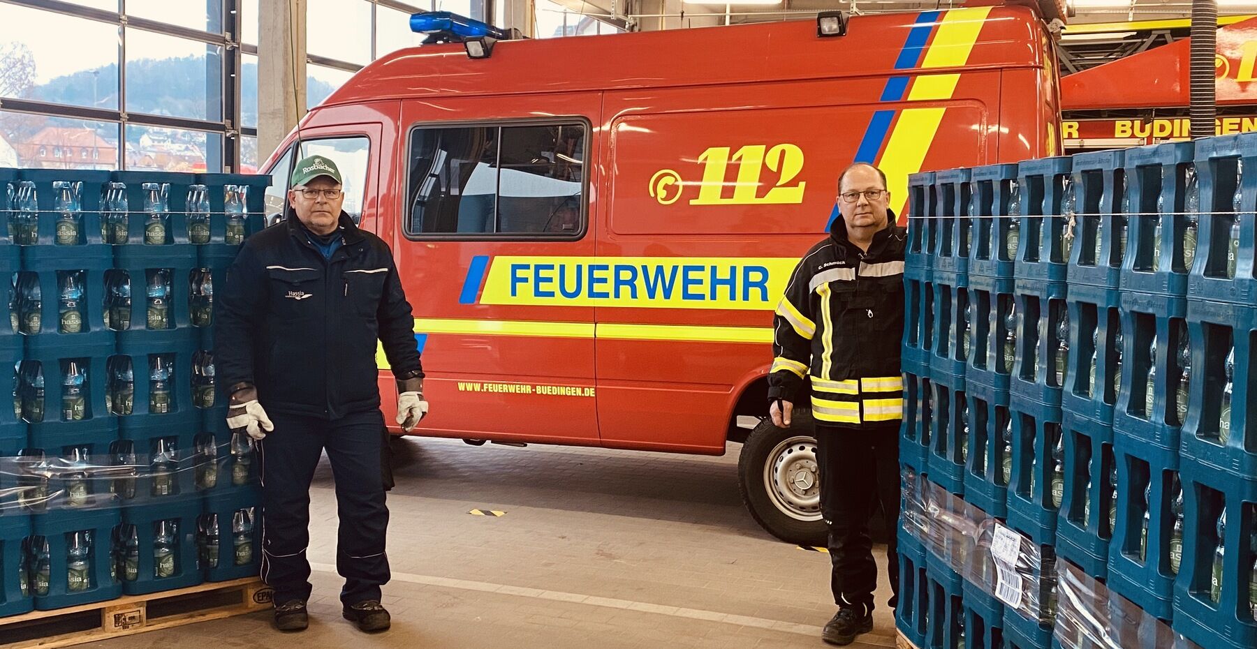 Büdingen, den 2.2.2021 – Am vergangenen Wochenende stand die gut erhaltene mittelalterlich Altstadt von Büdingen nach einem Dammbruch komplett unter Wasser. Die Deutsche Lebens-Rettungs-Gesellschaft musste mit Booten die Anwohner aus ihren Häusern evakuieren. Nun gilt es, den verbleibenden Schlamm und Unrat weg zu räumen. Rund 200 Helfer, bestehend aus Feuerwehr und Freiwilligen, packen mit an. Roman Pilok (links) aus dem HassiaHILFT-Team brachte 3.840 Liter hassia Mineralwasser vorbei. Karsten Schmück (rechts), stellvertretender Wehrführer Büdingen, nahm die willkommene Spende entgegen.