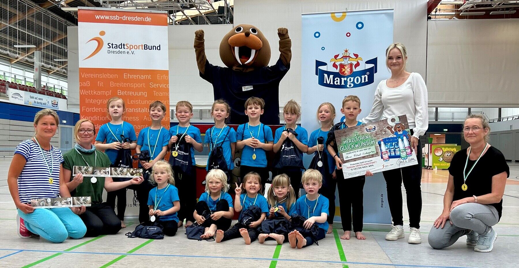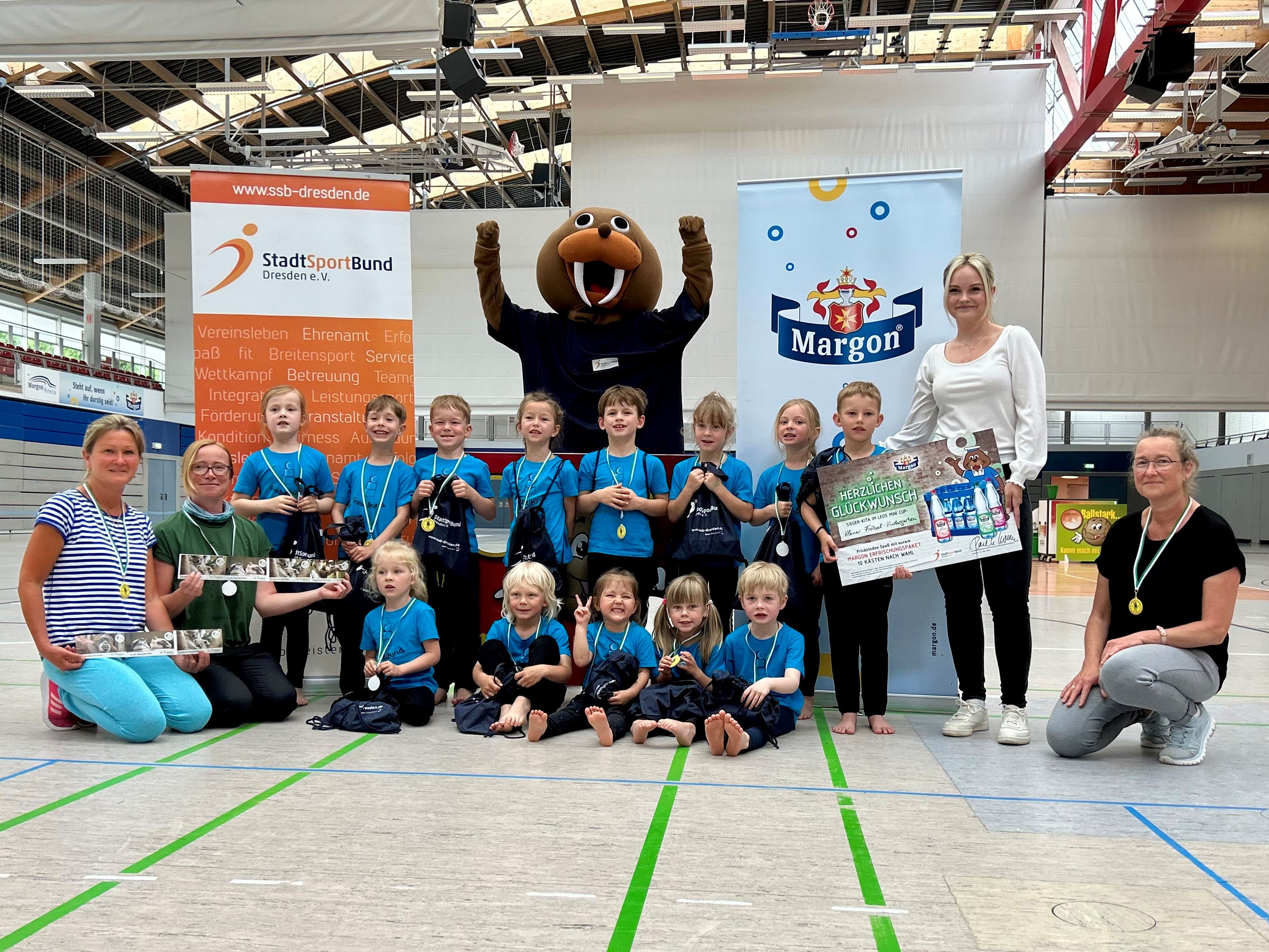 Natürlich ist die Traditionsmarke Margon in diesem Jahr wieder mit am Start, denn regelmäßiges Trinken leistet einen wichtigen Beitrag zur gesunden körperlichen und geistigen Entwicklung von Kindern. Die Gewinner-Kita Übigauer Großfamilie e. V./Kleiner Fröbel-Kindergarten erwartete in diesem Jahr eine besondere Überraschung: Ein Margon Erfrischungspaket, das die jungen Sportler für ihre großartigen Leistungen belohnt. Brand Managerin von Margon, Julia Otto: „Regelmäßige Bewegung in Verbindung mit einer ausgewogenen Trinkernährung bildet ein wichtiges Fundament für die kindliche Entwicklung. Es ist uns eine Freude, den Leos Mini Cup zu unterstützen und damit einen Beitrag zur Förderung der Gesundheit und des Wohlbefindens der Kinder zu leisten.“