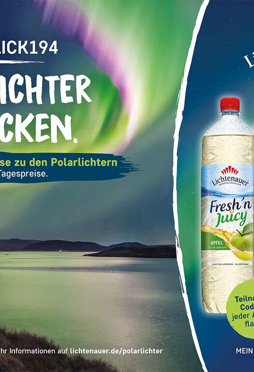 Die Sonne lacht, die Temperaturen steigen und die Urlaubszeit steht bevor. Doch dieser Sommer wird anders als die vergangenen. Abstandsregeln, Mundschutz, Kontaktbeschränkungen und weniger bis gar keine Urlaubsreisen. Gerade in diesem Jahr fallen die langersehnten Urlaube bei den Meisten anders aus als ursprünglich geplant. Lichtenauer schafft in dieser Zeit den notwendigen Lichtblick und verlost neben hochwertigen Tagespreisen eine Reise für zwei Personen zu den Polarlichtern. Die Glückscodes befinden sich auf Lichtenauer Fresh'n-Getränken mit dem Aktionsetikett "Polarlichter entdecken".