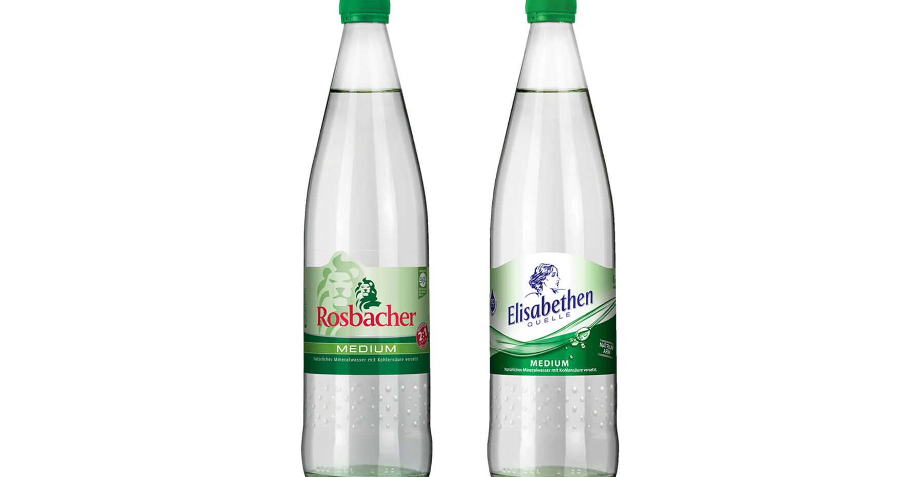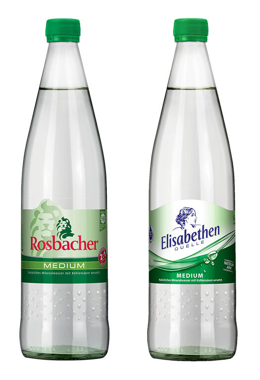 Rosbacher Medium und Elisabethen Quelle Medium stehen sowohl in der 1,0 Liter Glas-Mehrwegflasche, 0,75 Liter Glas-Mehrwegflasche als auch in der 1,0 Liter PET-Mehrwegflasche zur Verfügung.