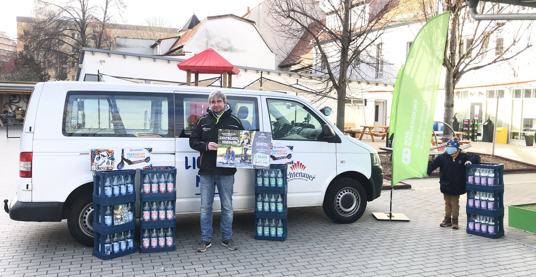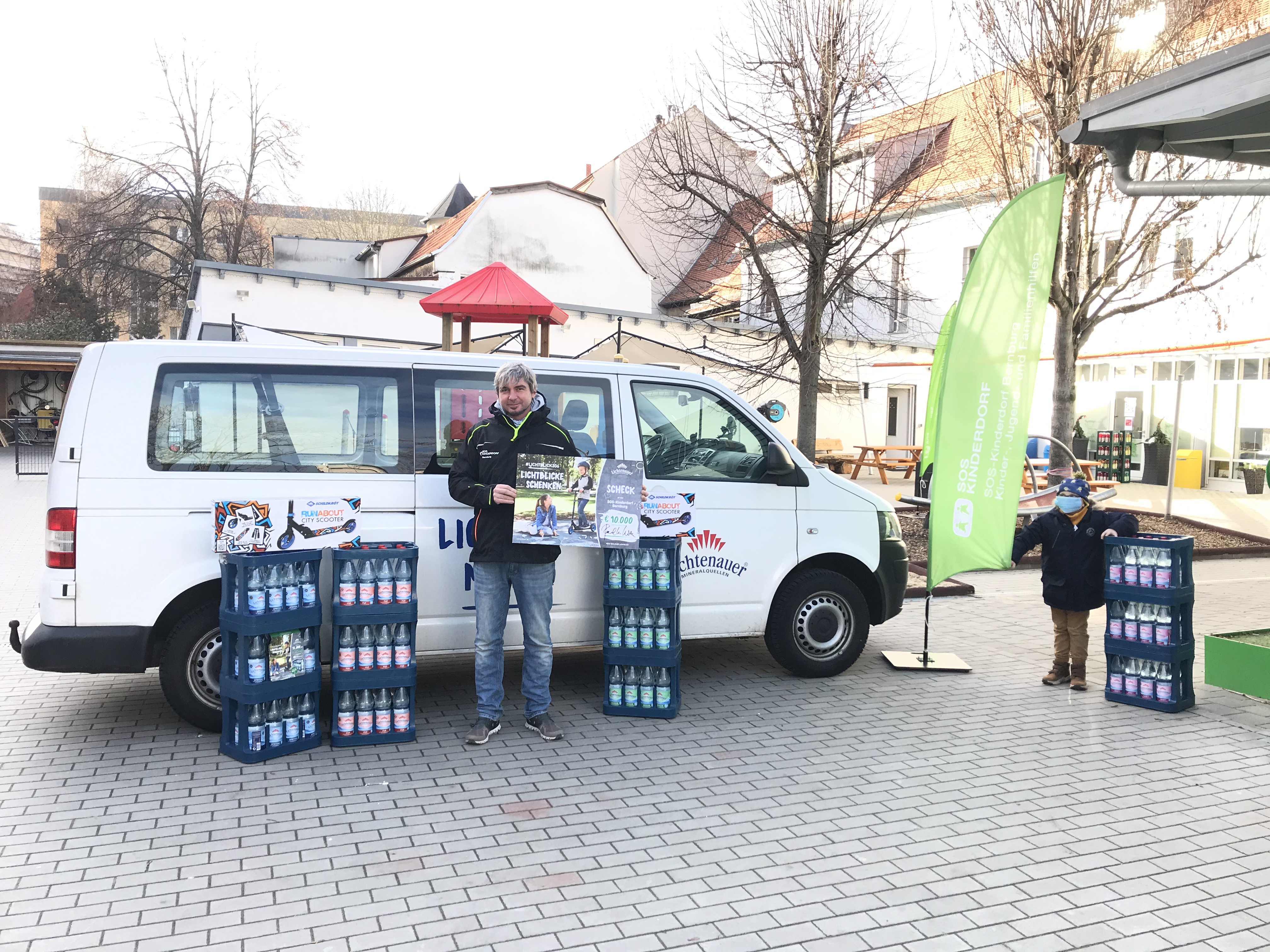 Bildunterschrift: Das „Lichtblick-Mobil“ lieferte den Scheck gemeinsam mit einer Auswahl Lichtenauer Erfrischungen an das SOS-Kinderdorf Bernburg.