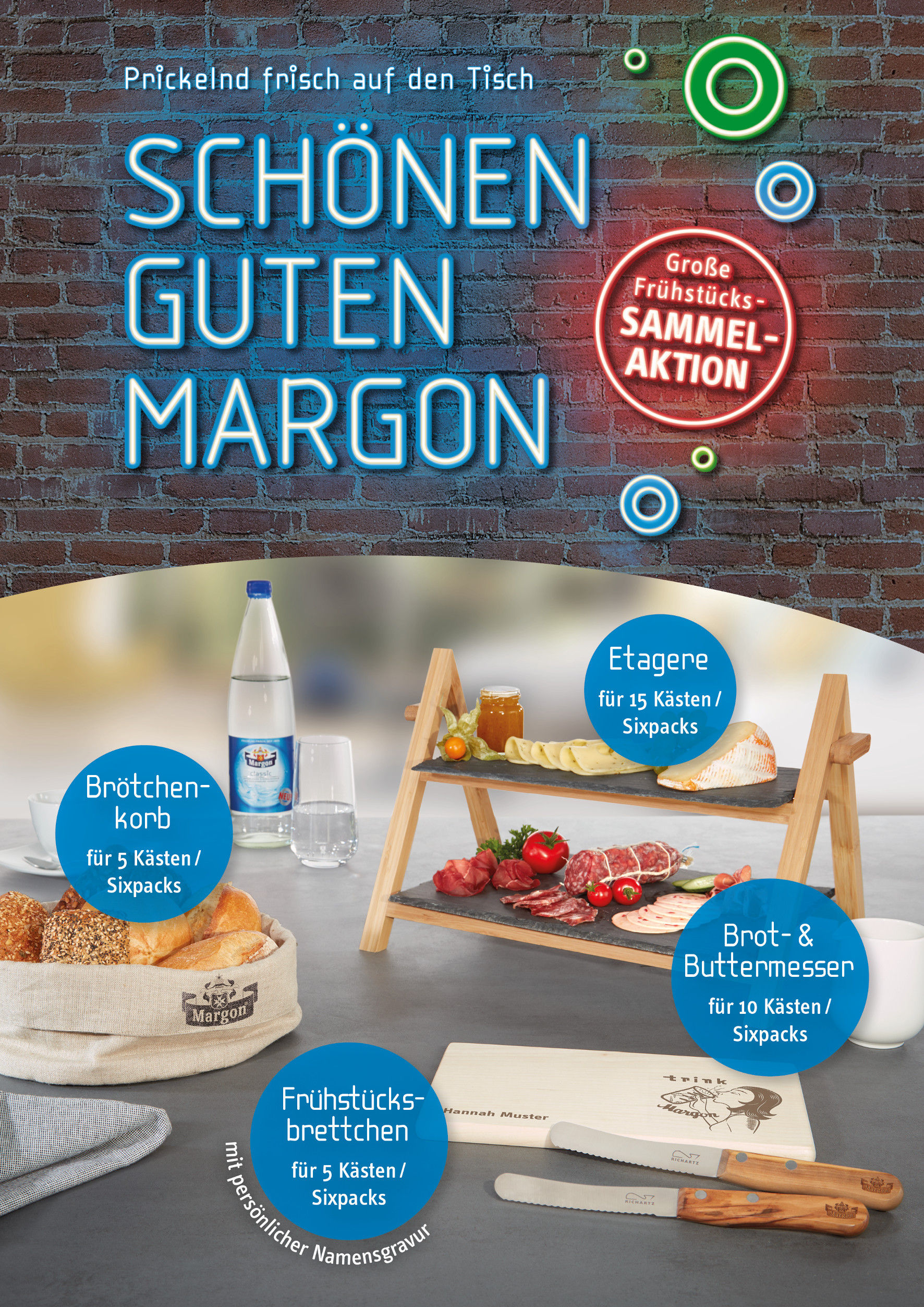 Schon für fünf Getränkekästen oder Sixpacks können Margon-Kunden zwischen einem Brotkörbchen aus Leinen oder zwei Frühstücksbrettchen mit individueller Namensgravur wählen. Ab zehn Getränkekästen oder Sixpacks gibt es ein 2er-Set Brot- und Buttermesser und Verbraucher, die 15 Kästen oder Sixpacks vorweisen können, erhalten eine Etagère im modernen Look aus Bambus und Schieferplatten. „Die hochwertigen Prämien für den Frühstückstisch unterstreichen noch einmal unsere Margon-Kampagne zum Thema Tischkultur für unsere neuen 1,0-Liter-Glas-Individualflaschen und damit auch die Qualität unserer Produkte“, berichtet Markenmanagerin Susan Mattausch.
