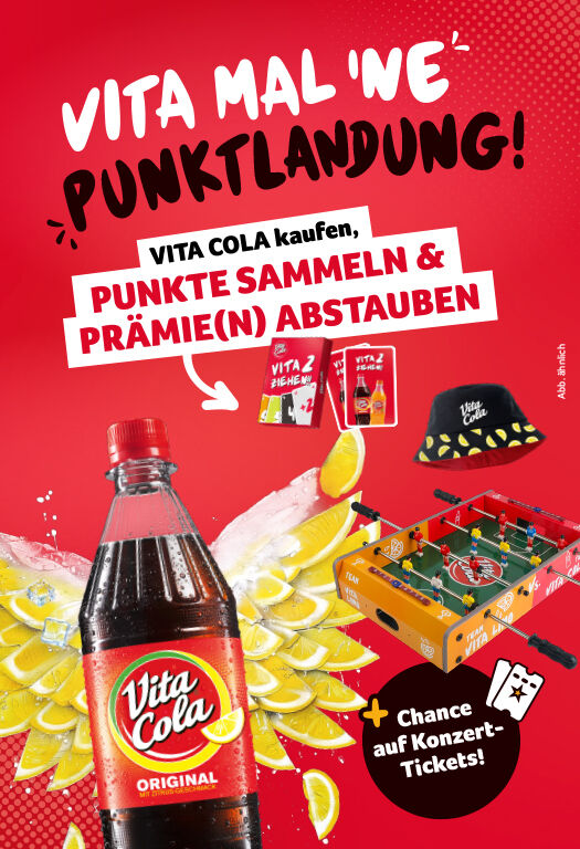 Wer im Aktionszeitraum vom 1. April bis zum 30. Juni 2026 VITA COLA oder VITA LIMO in der als Haushaltsgröße beliebten 1,0-l-PET-Mehrwegflasche kauft und den Kassenbon auf vitacola-aktion.de oder per WhatsApp hochlädt, sammelt pro Flasche einen Punkt. Für 12 Punkte erhält der Shopper das VITA COLA Kartenspiel „VITA 2 ziehen“. Für 48 Punkte gibt´s einen VITA COLA Bucket Hat zum Wenden und wer 96 Punkte sammelt, wird mit einem VITA COLA Mini-Tischkicker „Team VITA COLA vs. Team VITA LIMO“ belohnt.