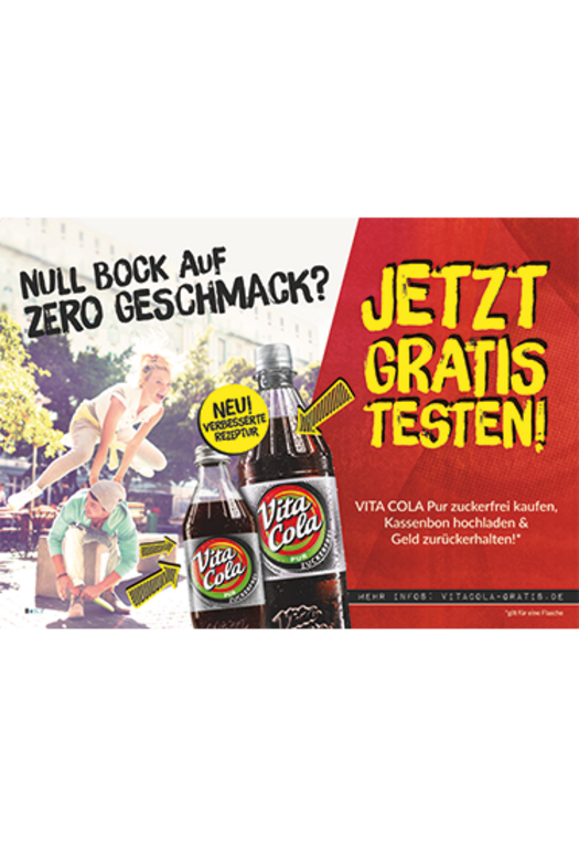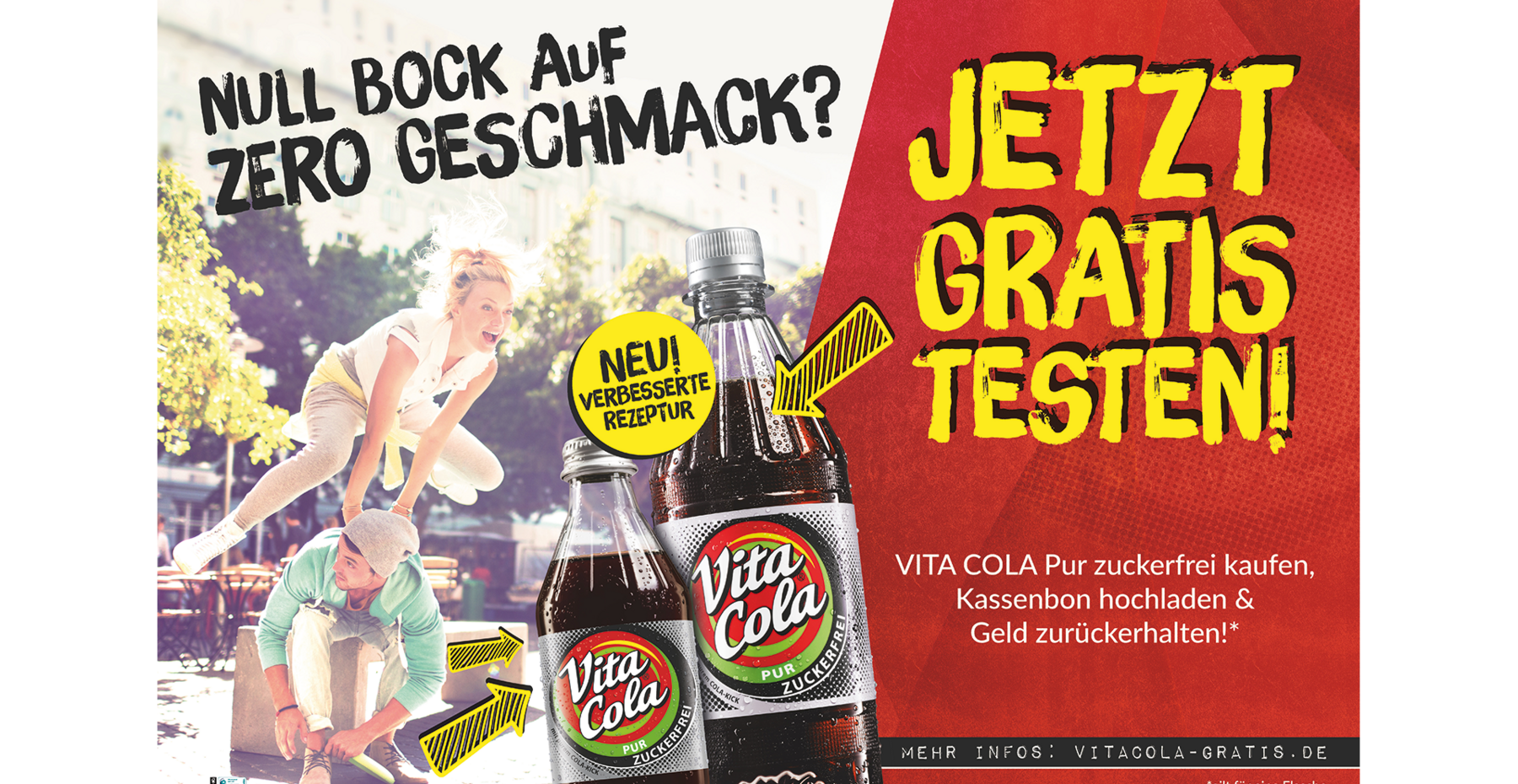 Die Testaktion läuft von August bis Ende Oktober. Großflächenplakate, Funk- und Onlinewerbung sowie POS-Aufbauten machen darauf aufmerksam. Zusätzlich werden umfassende Probierkontakte generiert. Dafür kooperiert VITA COLA mit Influencern und verlost Probierpakete über die eigenen Social-Media-Kanäle. Zudem wird VITA COLA Pur Zuckerfrei über Produkttesterboxen verteilt. Im studentischen Umfeld erfolgt das Sampling durch Erstsemestertüten.