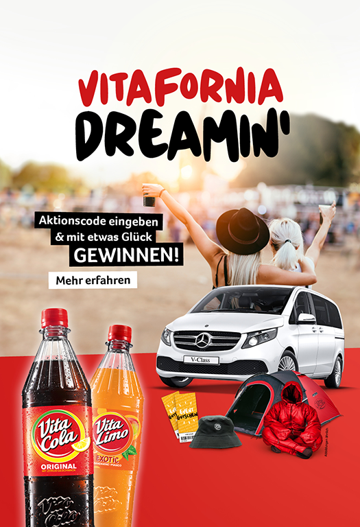 Jeder online unter www.vitacola-dreaming.de eingegebene Aktionscode eröffnet die Chance auf einen der attraktiven und festivaltauglichen Sofortgewinne. Darunter sind 4-Personen-Zelte, Hygger Schlafsäcke und sogenannte Anglerhüte, aber auch eventim-Gutscheine im Wert von jeweils 150 €, die man z.B. für Festivalkarten einlösen kann. Am Ende wird unter allen Teilnehmern der Hauptpreis verlost - eine Mercedes Benz V-Klasse im Wert von über 62.000 Euro bringt dem Hauptgewinner maximale Freiheit und Unabhängigkeit, sei es auf einem Festival oder bei Outdoortrips.