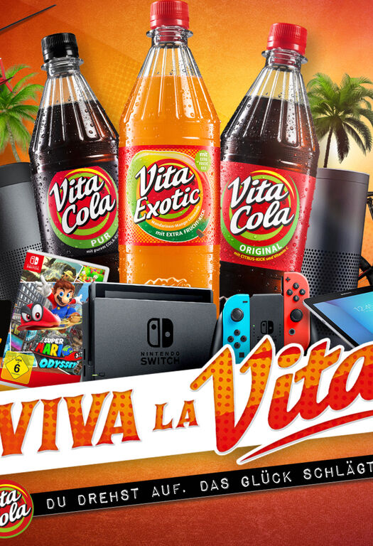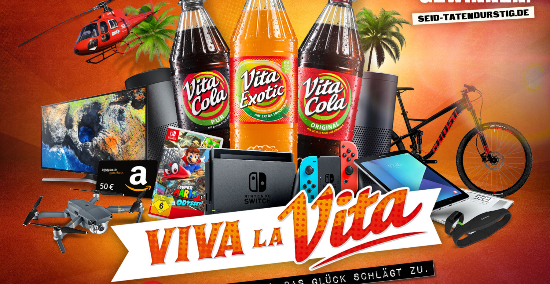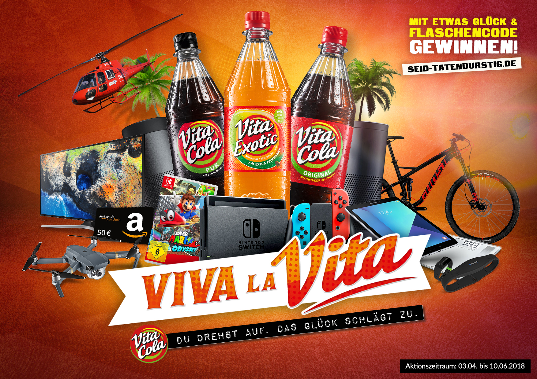 Schmalkalden/Lichtenau, 28. März 2018. Mit einer Rekordmenge von ca. sieben Millionen Flaschen geht VITA COLA vom 3. April bis 10. Juni 2018 in ihre diesjährige Jahrespromotion. Unter dem Motto „Viva la VITA – Du drehst auf. Das Glück schlägt zu.“ sind im Aktionszeitraum auf den 1,0 l PET-Mehrwegflaschen von drei Cola- und vier Limonadensorten Gewinnspielcodes zu finden. Durch deren Eingabe auf www.seid-tatendurstig.de haben alle Teilnehmer die Chance auf 60 attraktive Gewinne, mit denen sich das Leben gut genießen lässt. Dazu gehören u. a. ein Kurztrip ins Warme, Helikopterflüge über Berlin, Tablets und Smart-TVs von Samsung, Ghost Mountainbikes oder Amazon-Gutscheine im Wert von je 50 €.