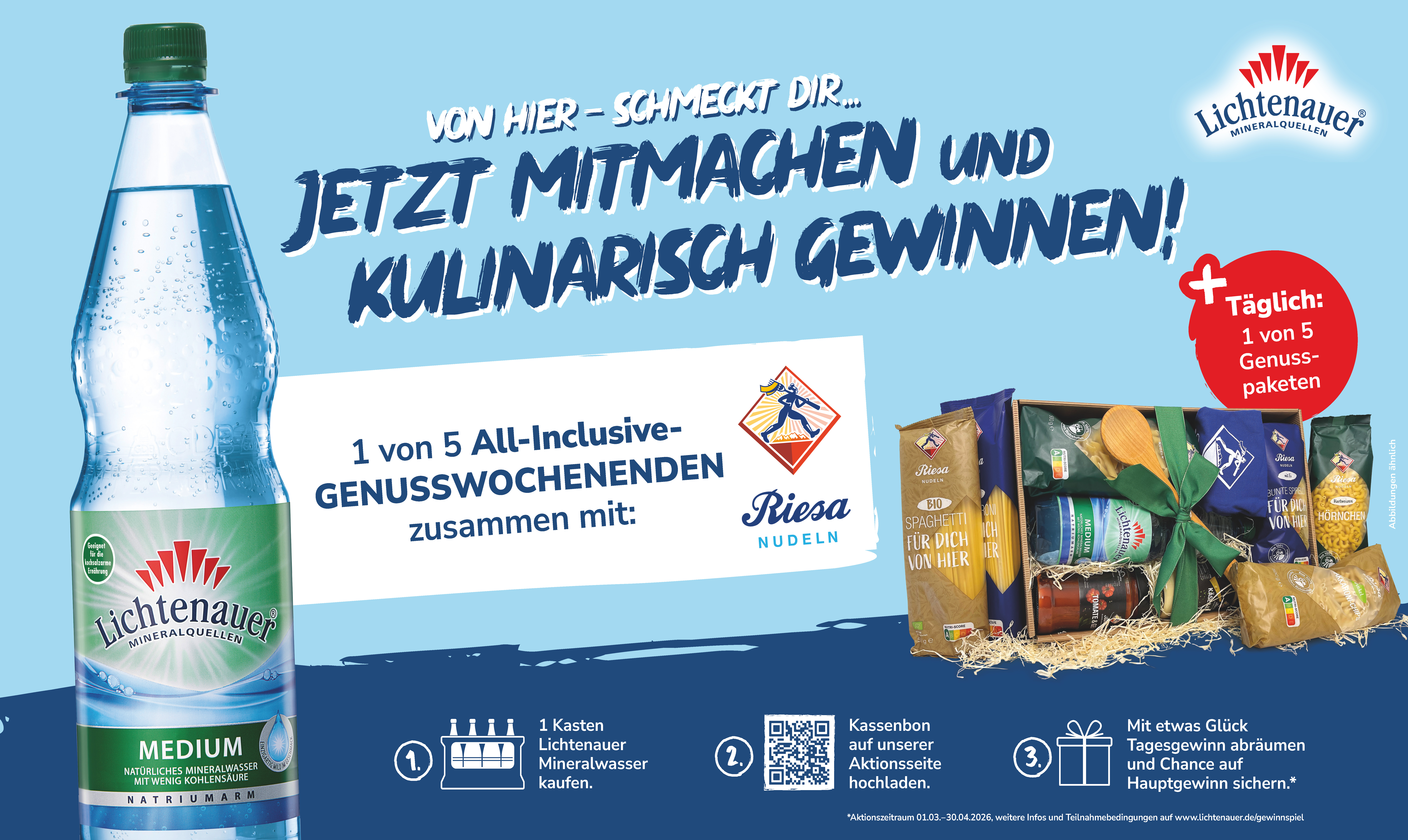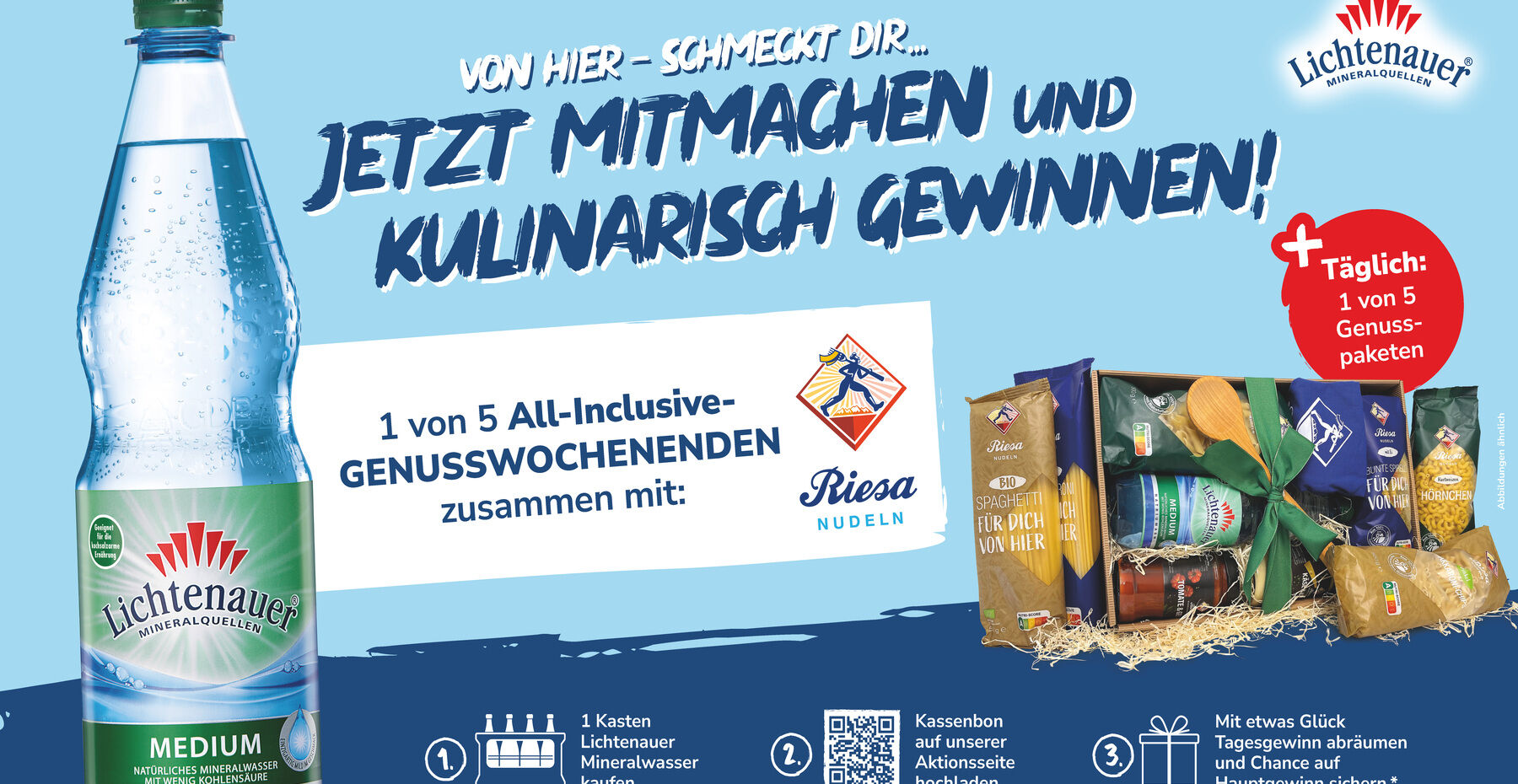 Lichtenauer setzt mit seiner neuen Consumer Promotion auf Regionalität und kooperiert dafür mit einem ebenso starken Partner. Unter dem Motto „Von hier – schmeckt dir“ bieten die beiden sächsischen Erfolgsmarken Lichtenauer und Riesa Nudeln Konsumenten die Gewinn-Chance auf eines von fünf All-inclusive Genusswochenenden in Riesa sowie eines von täglich fünf Genusspaketen mit einer Auswahl an Riesa Nudeln und Saucen sowie Lichtenauer Mineralwasser.